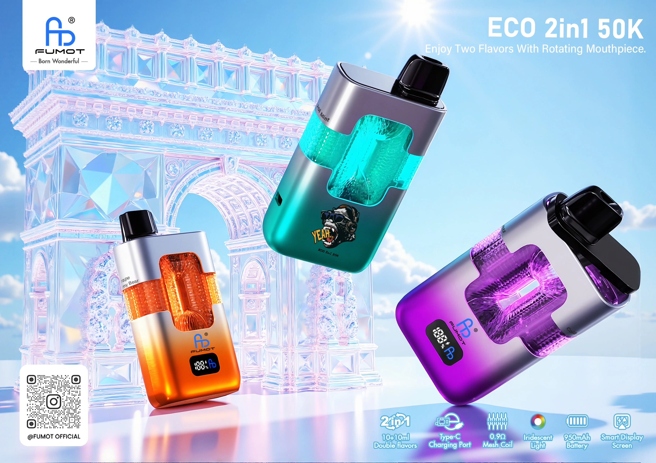Fumot ECO 2in1 50Kは、デバイスの交換をせずにバラエティを楽しみたい人向けの二重フレーバー高パフ使い捨て電子タバコです。回転式のマウスピースにより、同じユニットで二つのフレーバーを切り替えることができ、スマートディスプレイはバッテリー残量を一目で確認できます。0.9Ωのメッシュコイルを搭載し、長時間の使用でもスムーズな吸い心地とクリーンな味わいを維持します。