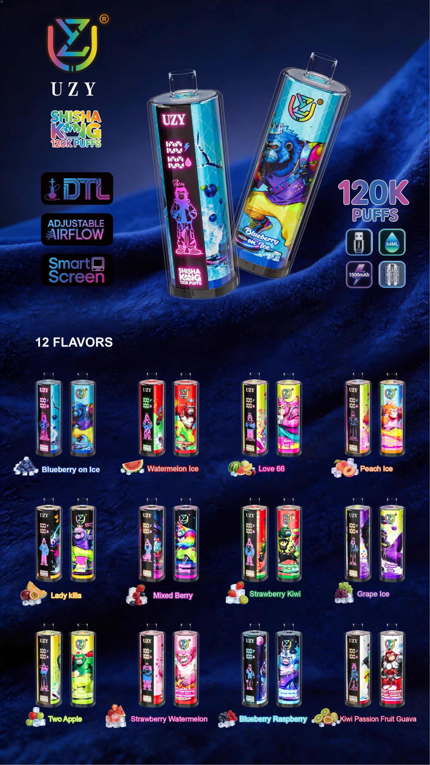 UZY Shisha Hookah King 120K puffs Flavors list: